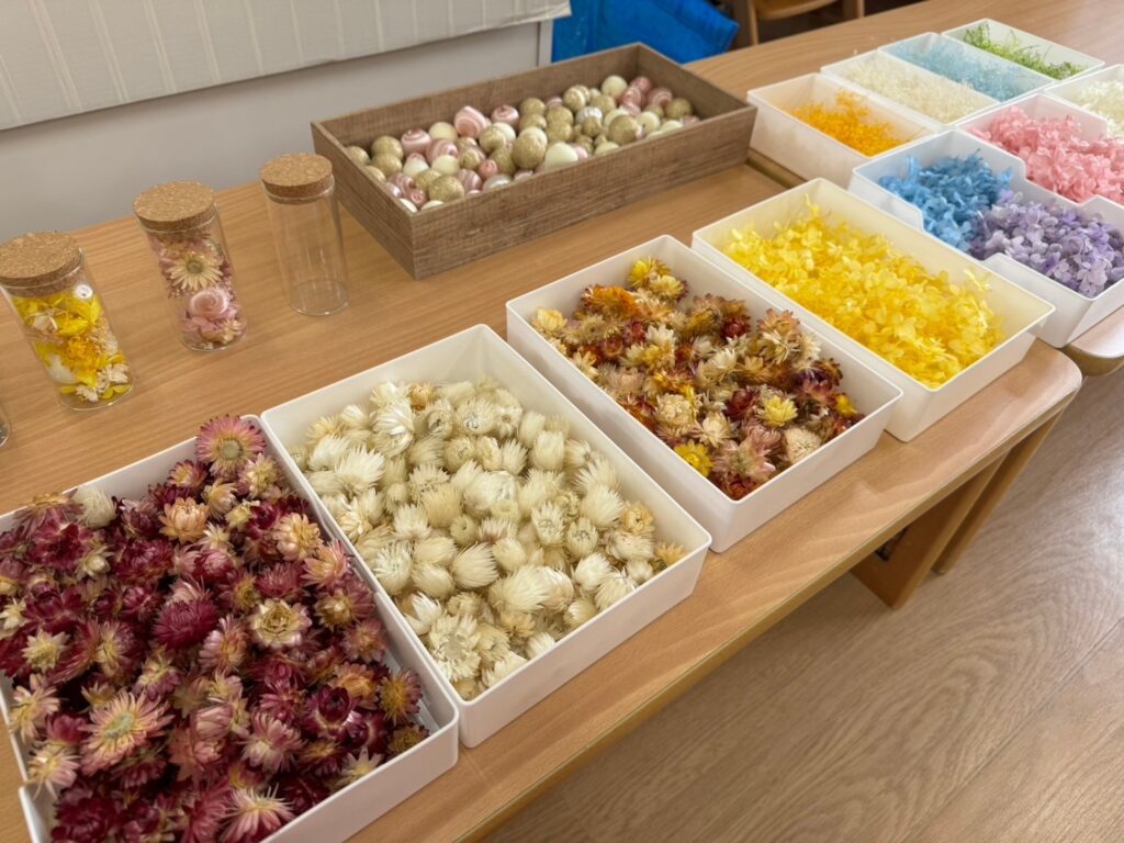 沢山のお花の中から、自分の好きなお花を自由に選び、ガラスのボトルの中へ詰めていきましたよ!